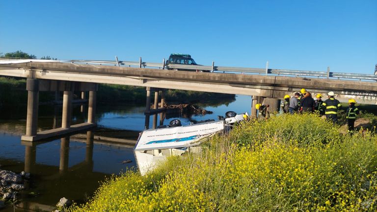 Un camión Mercedes Benz impacta la baranda de seguridad del puente del río Arrecifes y cae al vacio. Su conductor murió por el impacto.