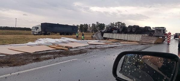 El accidente ocurrió esta mañana en el km 145 sentido a Rosario. Por razones que se desconocen, un semirremolque pierde el control, vuelca y queda obstruyendo el carril rápido de la autopista.