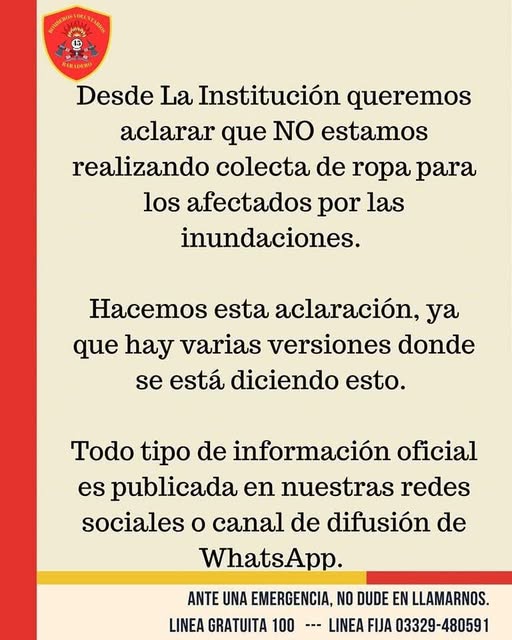 “Desde la Institución queremos aclarar que no estamos realizando colecta de ropa para los afectados por las inundaciones”, señala el comunicado de la institución.