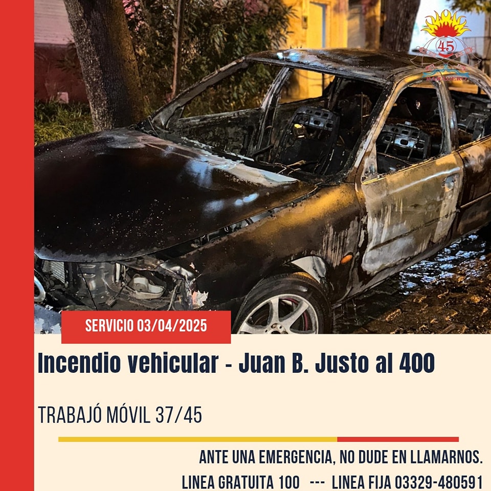 El segundo reporte fue a las 03:10 AM se desplazó móvil 37/45 por incendio de un vehículo en Juan B. Justo 470.