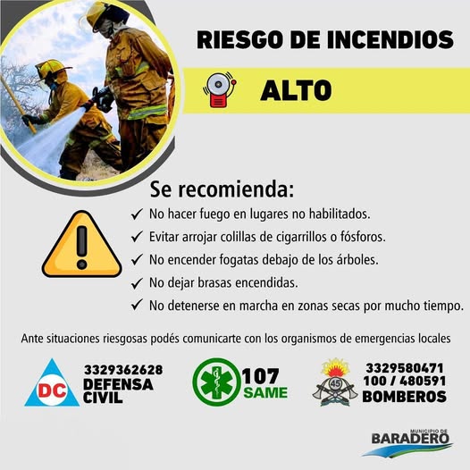 Solicitamos a la población extremar las precauciones, evitando realizar fuego en lugares no habilitados; apagar correctamente brasas y colillas de cigarrillos; y no detener vehículos en marcha en zonas secas por mucho tiempo.