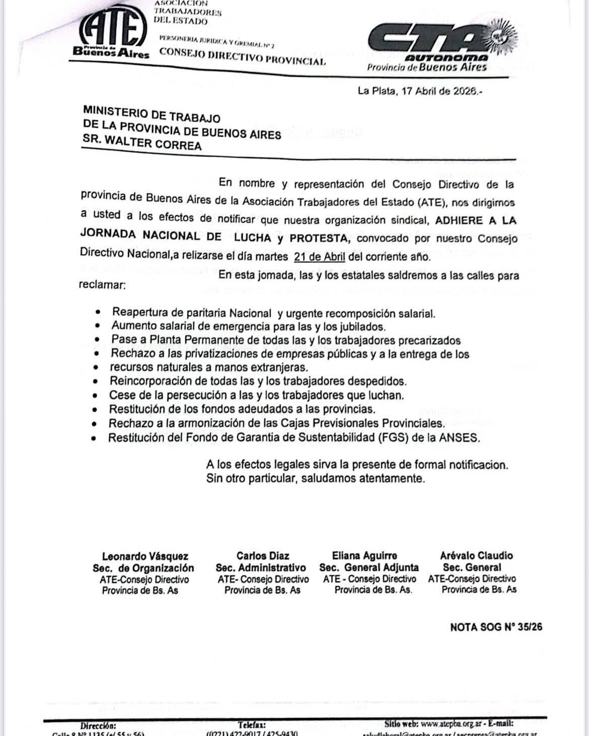 La medida se extenderá durante todo el día de hoy y se extiende a todo el país. Es a raíz del reclamo de apertura de paritarias y una recomposición salarial para los trabajadores del Estado nacional. En Baradero hay un acatamiento entre el 80% y 90%.