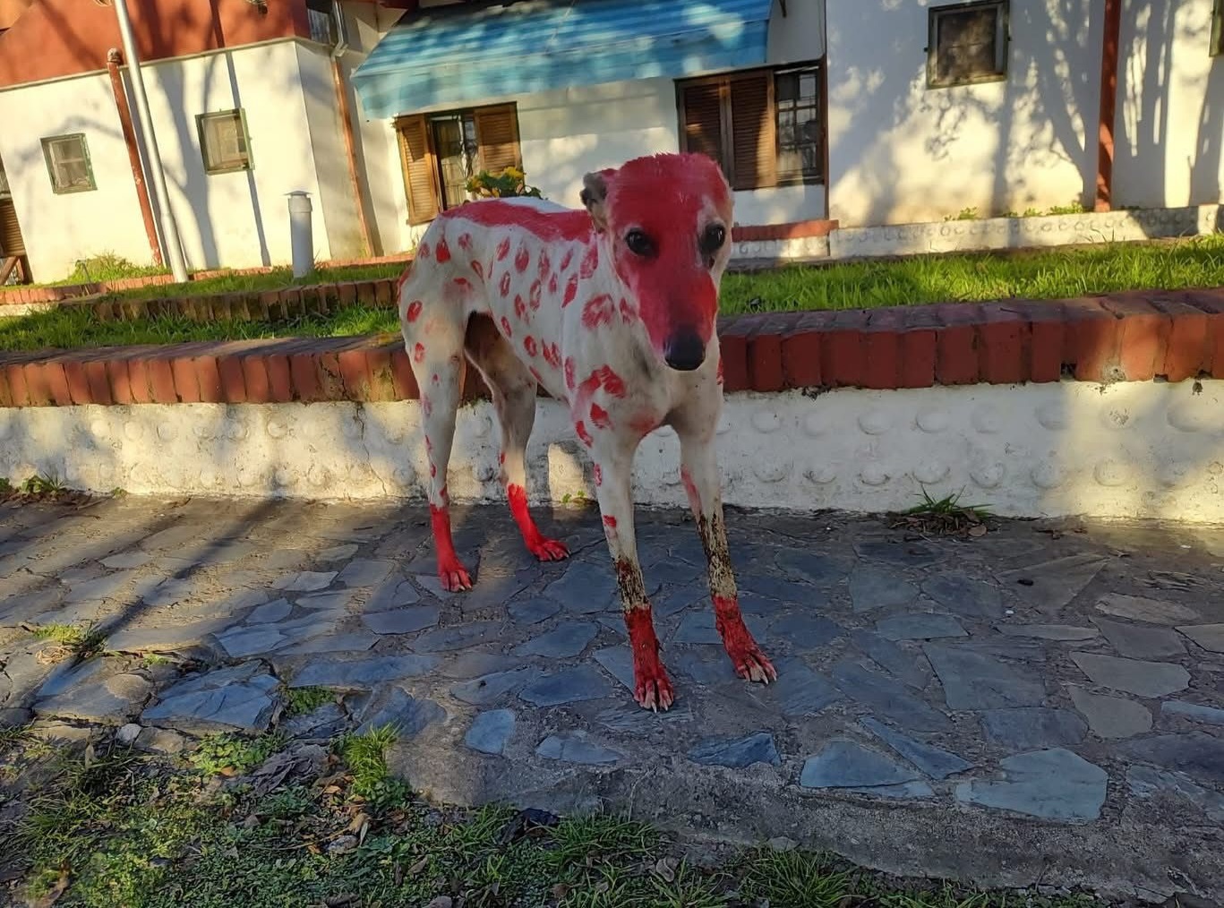 El animal fue hallado en Ruta 41, en cercanías a la zona del Tano Laino. La empleada de una residencia de adultos mayores fue quien la encontró. Tenía pintura acrílica en su cuerpo. Andrea Cano fue quien la rescató en primera instancia y a través de #TúRadio dijo que «desde hace días andaba rondando, pero no estaba pintada»
