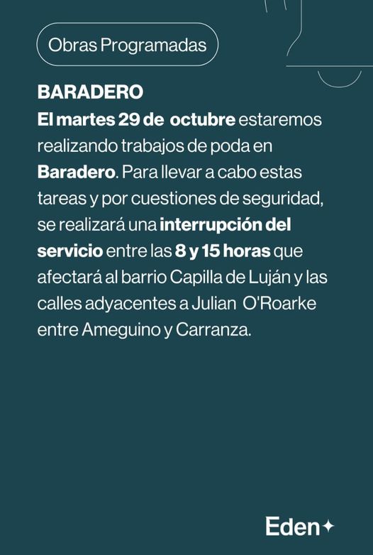 El comunicado agrega que «para realizar las tareas, se hará una interrupción del servicio que afectará el barrio Capilla de Luján y las calles adyacentes a O´Roarke entre Ameghino y Carranza».
