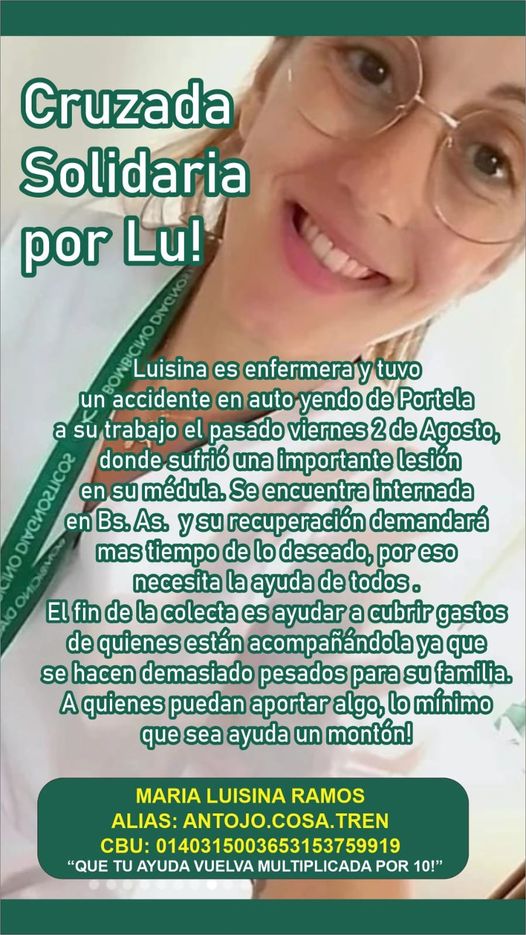 Amigos de la joven enfermera de Portela, quien sufrió un accidente tras volcar con su auto camino a Portela, habilitaron una cuenta para quien pueda colaborar.