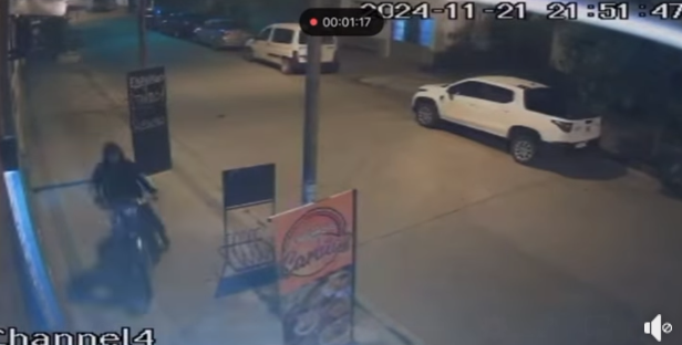 Alrededor de las 21 horas, un delincuente escapó con la Honda Wave color gris que se encontraba estacionada en René Simón y Oro. La huida quedó registrada en las cámaras de seguridad privadas.