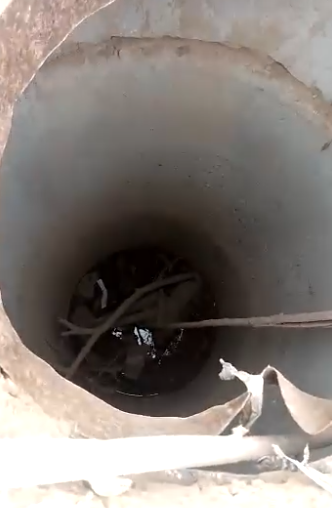 El animal quedó atrapado en el depósito cloacal que tiene el faltante de la tapa protectora. Fue en Dollera al 3300. Ramón Nuñez, propietario del animal, dijo a #TuRadio que «este problema viene desde hace meses».