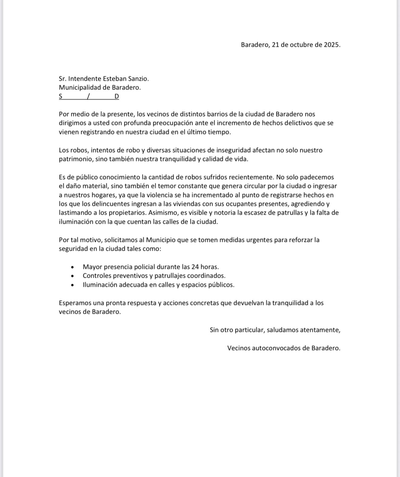 «La nota si bien se formó a esta zona, se fue extendiendo a conocidos y amigos de todo Baradero; no es solamente un tema del barrio sino de todo Baradero», indicó.