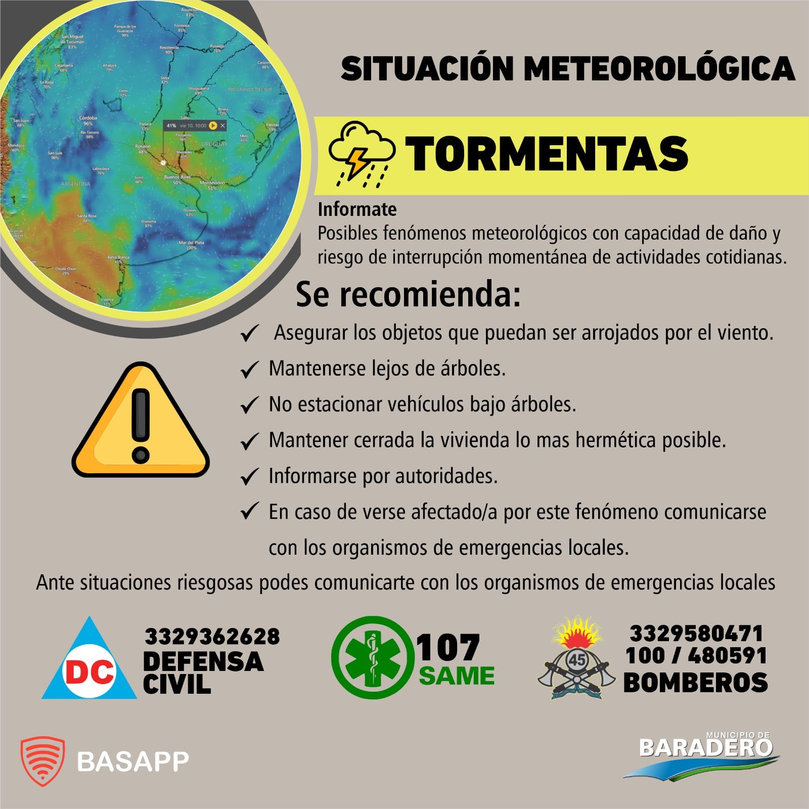 Alerta Amarilla por tormentas. Durante la mañana de hoy viernes 21 de junio la zona será afecta por lluvia y tormentas, algunas localmente fuertes. Las mismas podrán estar acompañadas por ráfagas intensas, actividad eléctrica fuerte, ocasional caída de granizo y abundante caída de agua en cortos periodos. Se estiman valores de precipitación acumulados entre 30 y 40mm.
