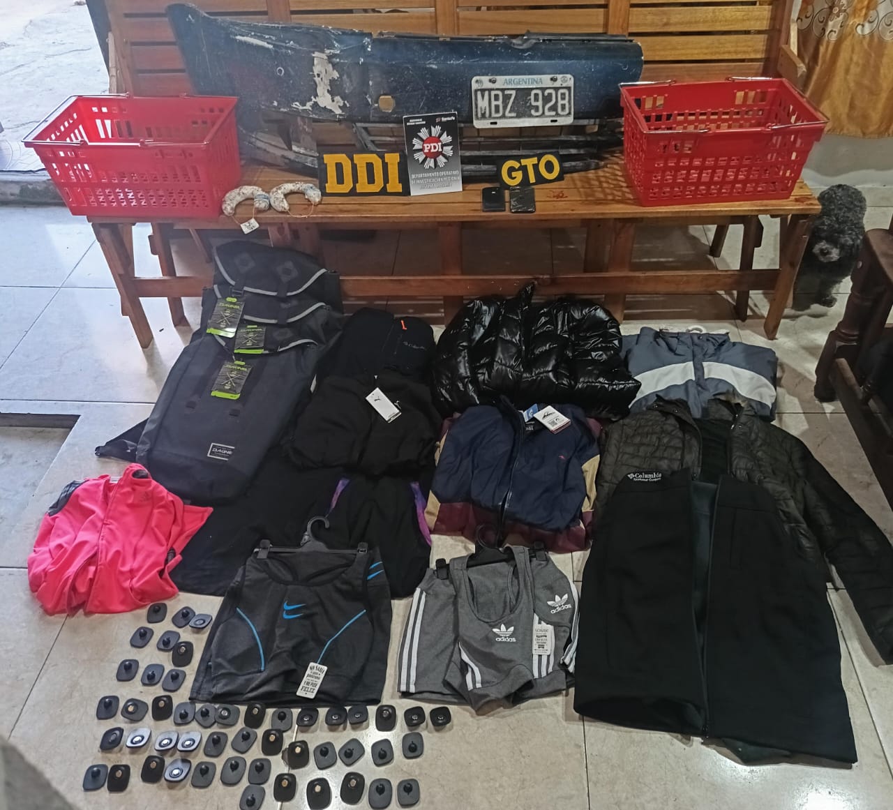 Ejecutada del modo ordenado el procedimiento arroja resultado en domicilio de calle E. Bulnes 7450, el secuestro de distintos elementos relacionados con las causas investigadas, tales como: dos canastos de supermercado , mochilas, prendas deportivas e informales con etiquetas (nuevas), teléfonos celulares, una chapa patente con el dominio que llevaba colocado el automóvil en el cual se movilizaran los malvivientes en oportunidad de cometidos los hechos investigados, y varios TAGS Antihurto (empleados por comercios para prevenir sustracción de ciertos artículos).