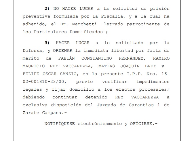 Por ello Fabián Fernández, Matías Brey y Felipe Sanzio -hijo del intendente de Baradero- quedaron en libertad.