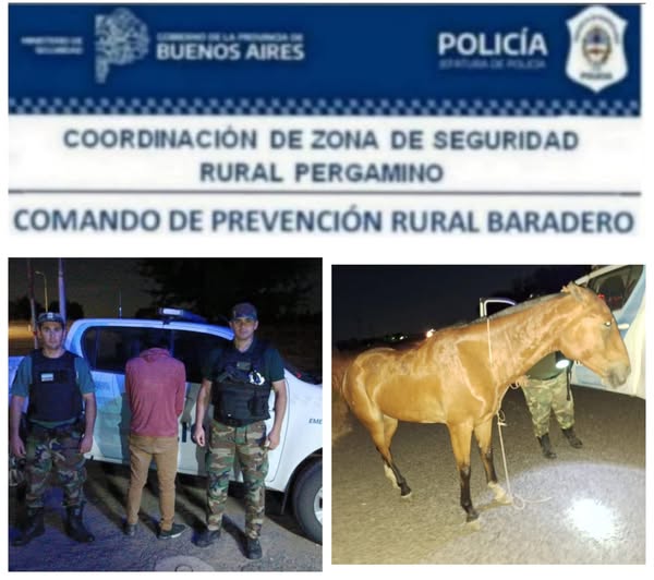 El CPR informó que «en la recorrida que hacía el móvil policial, por colectora de Ruta 9 -en sentido al basural municipal- advierten a un hombre, quien se dirigía caminando con un caballo zaino colorado, y al momento en que proceden a solicitarle la documentación del animal el mismo no pudo certificar la propiedad».
