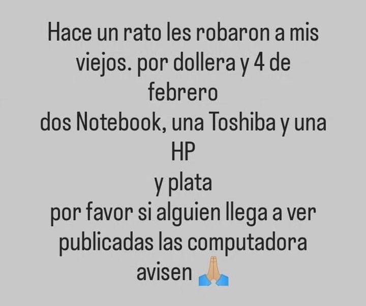 «Cuando llegaron a su casa, fueron a una galería que ellos tienen para descansar, porque estaban muy cansados por la lluvia y demás. Encontraron que habían roto dos trabas de dos puertas. Empezaron a buscar si faltaba algo, y se llevaron de la casa dos computadoras que tenian a la mano, una Toshiba negra recien reparada y una notebook Hp gris que nosotros usabamos para estudiar».