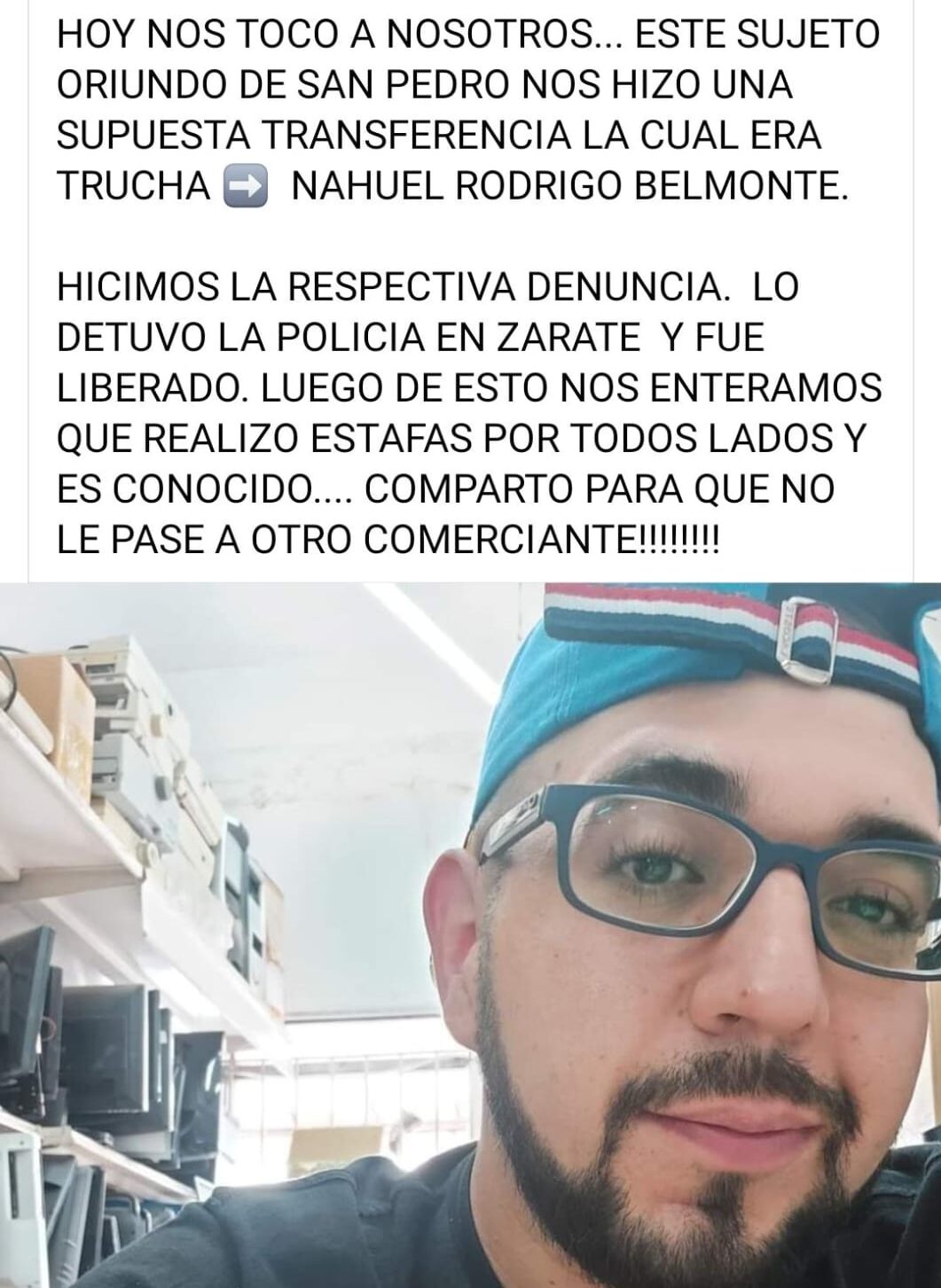 “Lo largaron al instante, me dijeron que estuvo preso mil veces. Cuando lo publiqué en redes sociales me llamó gente de San Pedro diciendo que también los había estafado”.