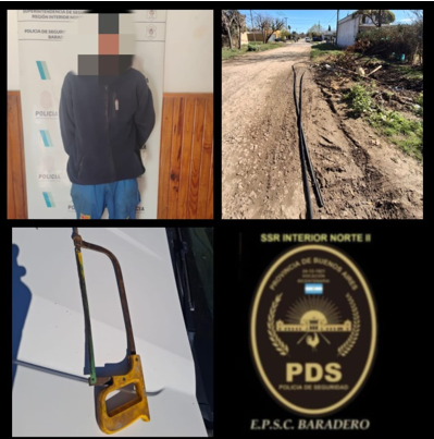 TENTATIVA DE ROBO: 05/08/05. Personal Policial EPSC Baradero, en intersecciones de Pasteur y Saavedra proceden a la aprehensión de un masculino de 25 años de edad, quien estaba cortando cables de teléfono, procediendo al secuestro del cableado y una sierra de mano. Aprehendido a disposición de la Fiscalía N° 8.