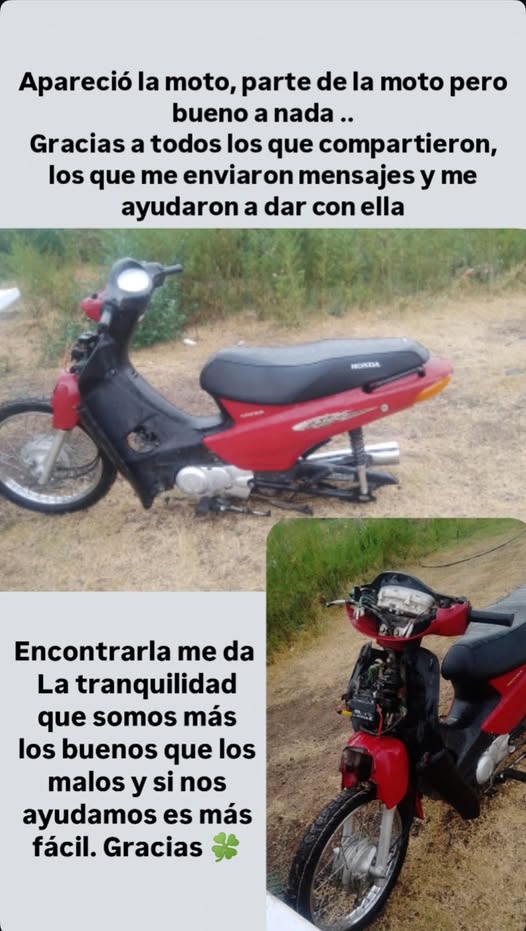 El domingo por la madrugada se llevaron una moto Honda Biz color roja que estaba estacionada en la esquina de Rodríguez y Anchorena. La dueña comenzó una campaña de difusión y hubo personas que vieron el momento en el que un sujeto caminaba con el rodado por calle Oro rumbo a la zona del Polideportivo.