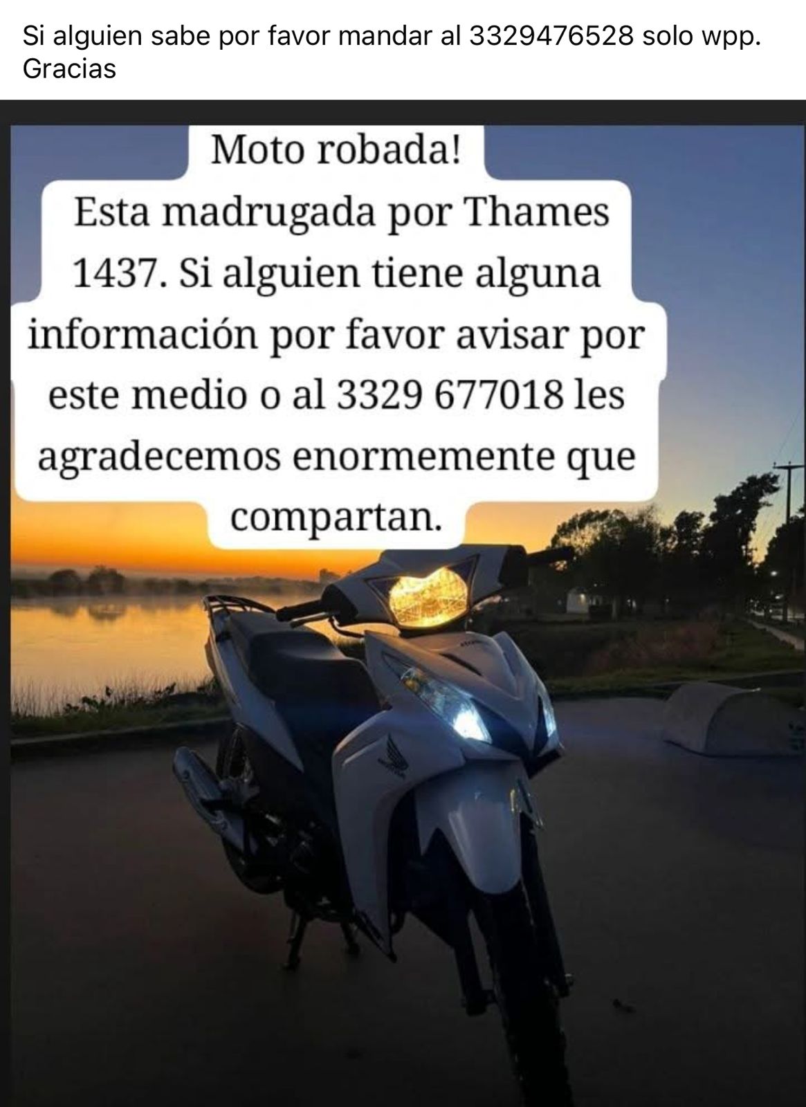 Se trata de una motocicleta blanca que fue sustraída el Domingo por la madrugada desde calle Thames al 1400. Valentina, su propietaria, manifestó: “La Policía nos dijo que teníamos que esperar respuestas para ver si lograban encontrar la moto”.