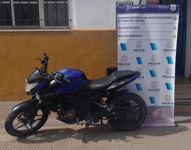 Personal de la DDI Baradero, encontrándose realizando labores de rutina en la vía pública, en interseccion de las calles Lugones y Del Corro de Baradero, procedió a la identificación de una motocicleta Bajaj Rouser 160 cc, de color azul, misma conducida por un masculino de 20 años de edad; constatandose el faltante de la chapa patente, por lo que consultado sistema informatico arroja resultado que por numeración de chasis y motor, el rodado posee pedido activo de secuestro por el delito de ROBO DE MOTOVEHICULO, la cual habria sido sustraida el día 29/03/24 en la localidad de Zarate; razón por la cual la motocicleta es secuestrada y trasladada a sede policial junto con conductor del rodado, quien es notificado del inicio de causa judicial caratulada ENCUBRIMIENTO, no disponiendo la fiscalía local en turno (UFI 9) ninguna otra medida para con esta persona.