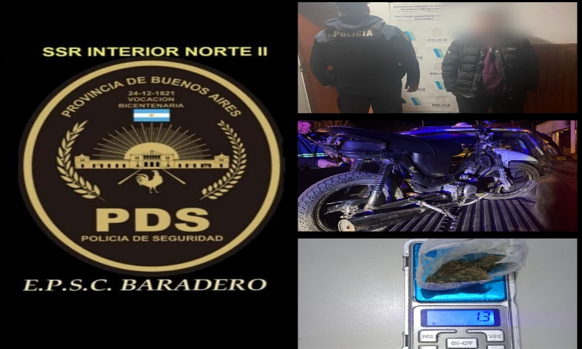 Fecha 9 del corriente en horas de la tarde personal policial en recorrido por calle Emilio Genoud entre Salguero y Cabrera identifica a masculino de 19 años, quien circulaba a bordo de motocicleta Corven 110cc sin dominio y sin documentación alguna. Asimismo, se procede al secuestro de un envoltorio de nylon con marihuana. Atento a ello Guardia Urbana colabora con el secuestro del rodado labrándose actuaciones por infracción a la ley de tránsito vigente, quedando el rodado a disposición del juzgado de Faltas de Baradero. En cuanto a la sustancia secuestrada se labraron actuaciones por tenencias de estupefacientes para consumo siendo notificado de la formación de la causa con intervención de la UFI nro, 8 de Baradero.