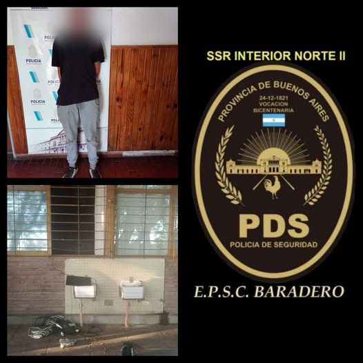 01FEBRERO25 Personal a raíz llamado, acude a escuela «Marcos Sastre» sito Acevedo N° 644 ciudad, donde un masculino intentó sustraer pertenencias del interior, ocasionando daños en reja y ventanas en el proceso, se fuga a la carrera del lugar y se inicia persecución, logrando a posterior la aprehensión del mismo en las intersecciones de las calles Araoz y Santa María de Oro, resultando ser un sujeto de (25) años, a quien se lo notifica de los recaudos legales a disposición UFI 9 Baradero.