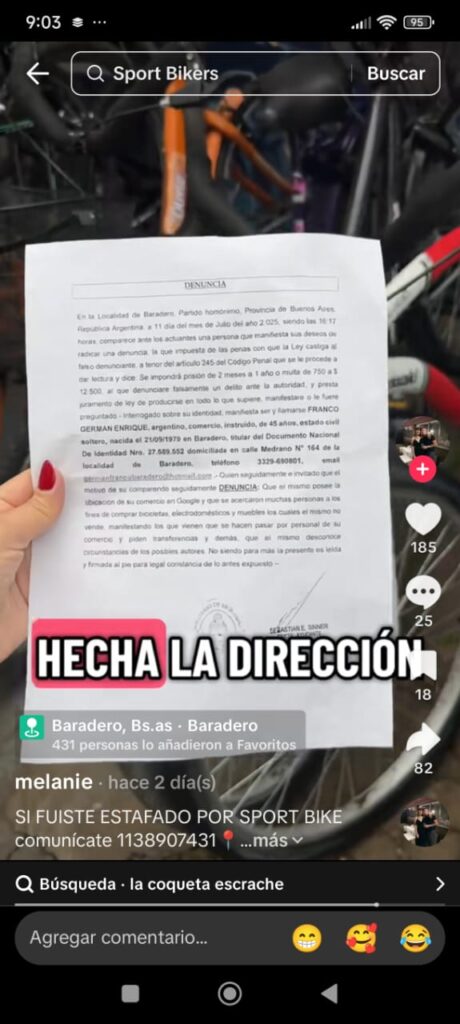 Usaban el nombre del local “Sportbike” y a través de tiktok ofrecían bicicletas a mitad de precio. Habían creado un perfil con el nombre de la bicicleteria y la dirección, pero el teléfono de contacto era de una mujer de capital. Con esas ventas estafaron a personas oriundas de otras ciudades. Incluso, personal del UTOI de La Matanza, cayó en la trampa y llegó al lugar. El propietario de la bicicletería baraderense descubrió el hecho al empezar a recibir a las personas que llegaban a Baradero.