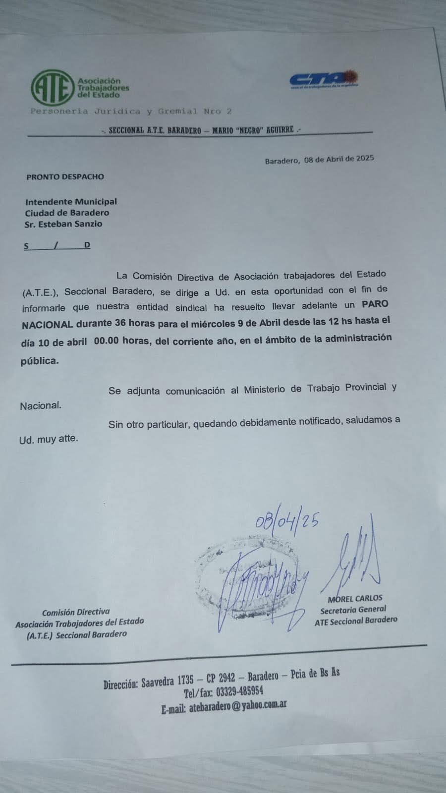 El gremio estatal envió una nota al municipio de Baradero indicado que “adhieren a la medida de 36 horas”.