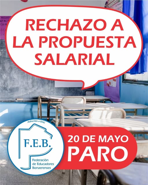 «De los gremios, el único que aprobó (la medida de fuerza) es la FEB. Nosotros queremos ratificar el paro del 20 de mayo de la FEB, el paro lo pueden hacer todos los docentes de la Provincia de Buenos Aires, es legal, es un derecho consitucional, y puede ir a descuento o no según lo decide la gestión», afirmó.