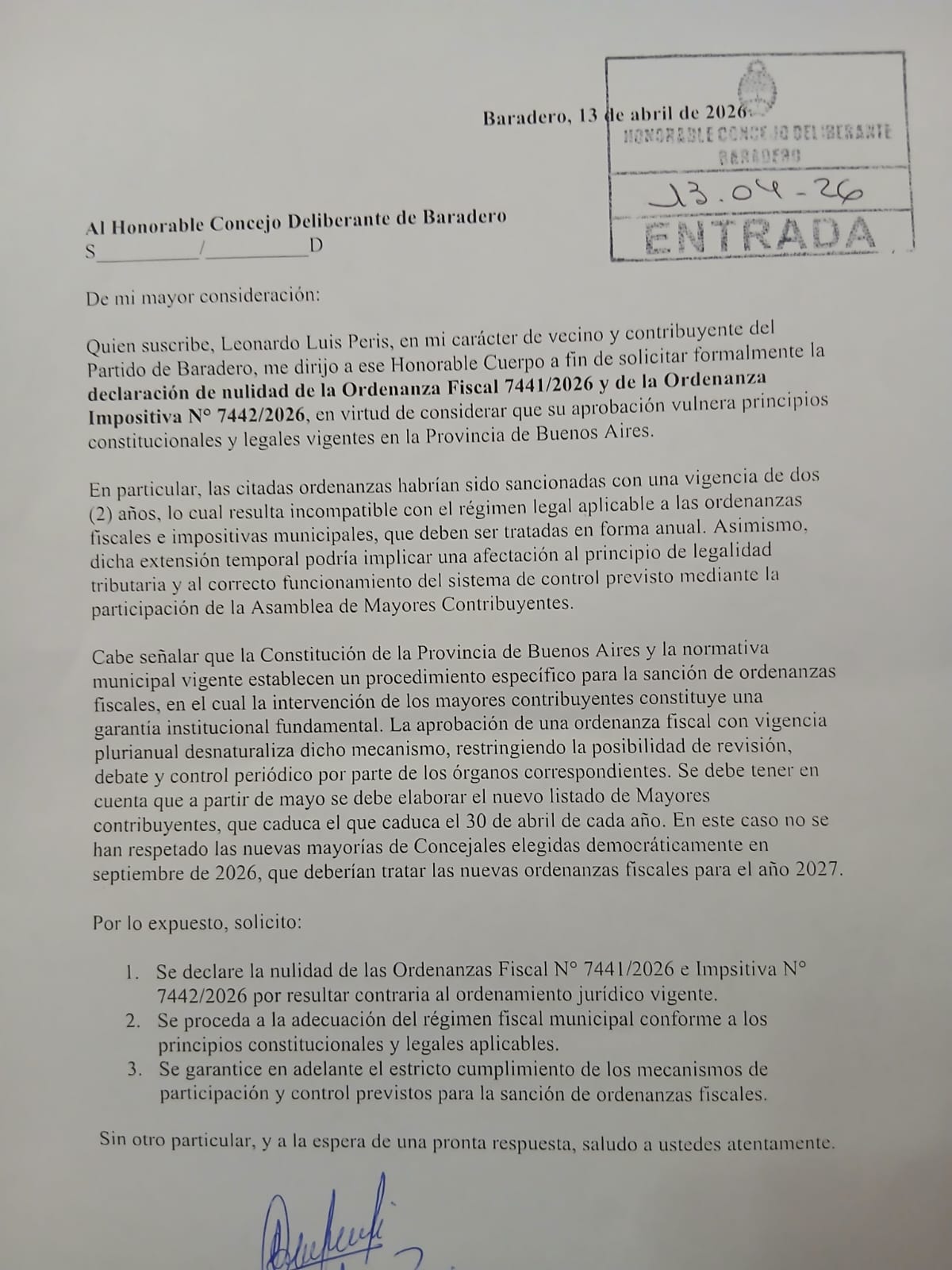 La presentación fue realizada en el día de ayer por Leonardo Peris, vecino de Baradero, al Concejo Deliberante. En ella, solicita la nulidad de la ordenanza fiscal impositiva que rige para el año 2026 y 2027 por “no respetarse las mayorías constitucionales tras la última elección”.