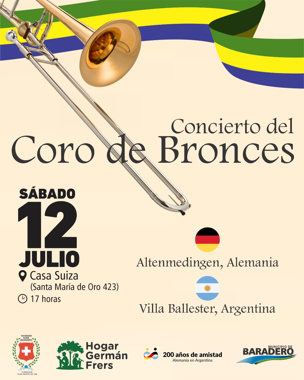 Como parte del bicentenario de la inmigración alemana en Argentina y con el apoyo de Hogar Germán Frers se podrá disfrutar en la Casa Suiza de un concierto internacional de bronces con la participación de dos coros: Altenmedingen (Alemania) y otro de Villa Ballester (Argentina).