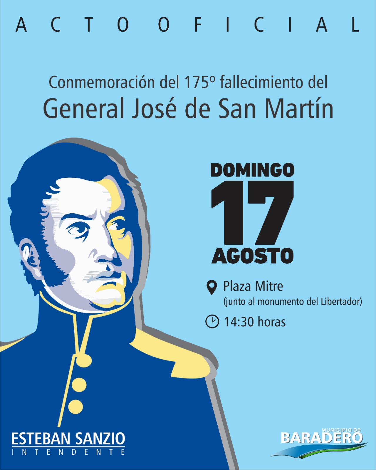 El Municipio de Baradero invita a la comunidad a participar del acto oficial en conmemoración del 175° aniversario del fallecimiento del General José de San Martín, que se realizará el domingo 17 de agosto en su monumento, en Plaza Mitre, a las 14.30 horas.