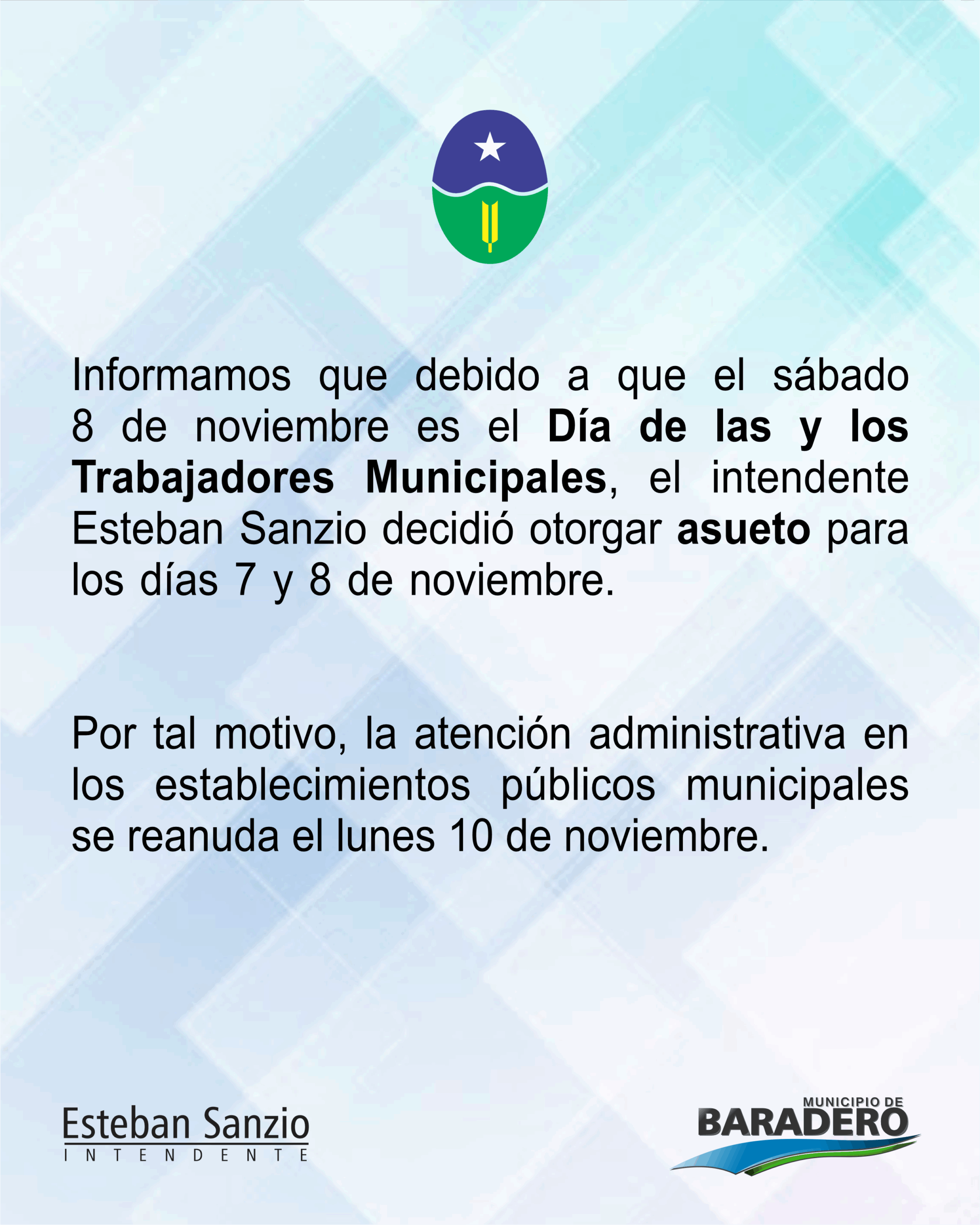 El Municipio de Baradero informa a la comunidad que, por decisión del Intendente Esteban Sanzio, en conmemoración del Día de las y los Trabajadores Municipales, que se celebra el sábado 8 de noviembre, se ha dispuesto asueto administrativo para el viernes 7 y sábado 8 de noviembre del corriente año. Por tal motivo, los servicios administrativos en las distintas dependencias municipales permanecerán cerrados durante el viernes, retomando su actividad el lunes 10 de noviembre.