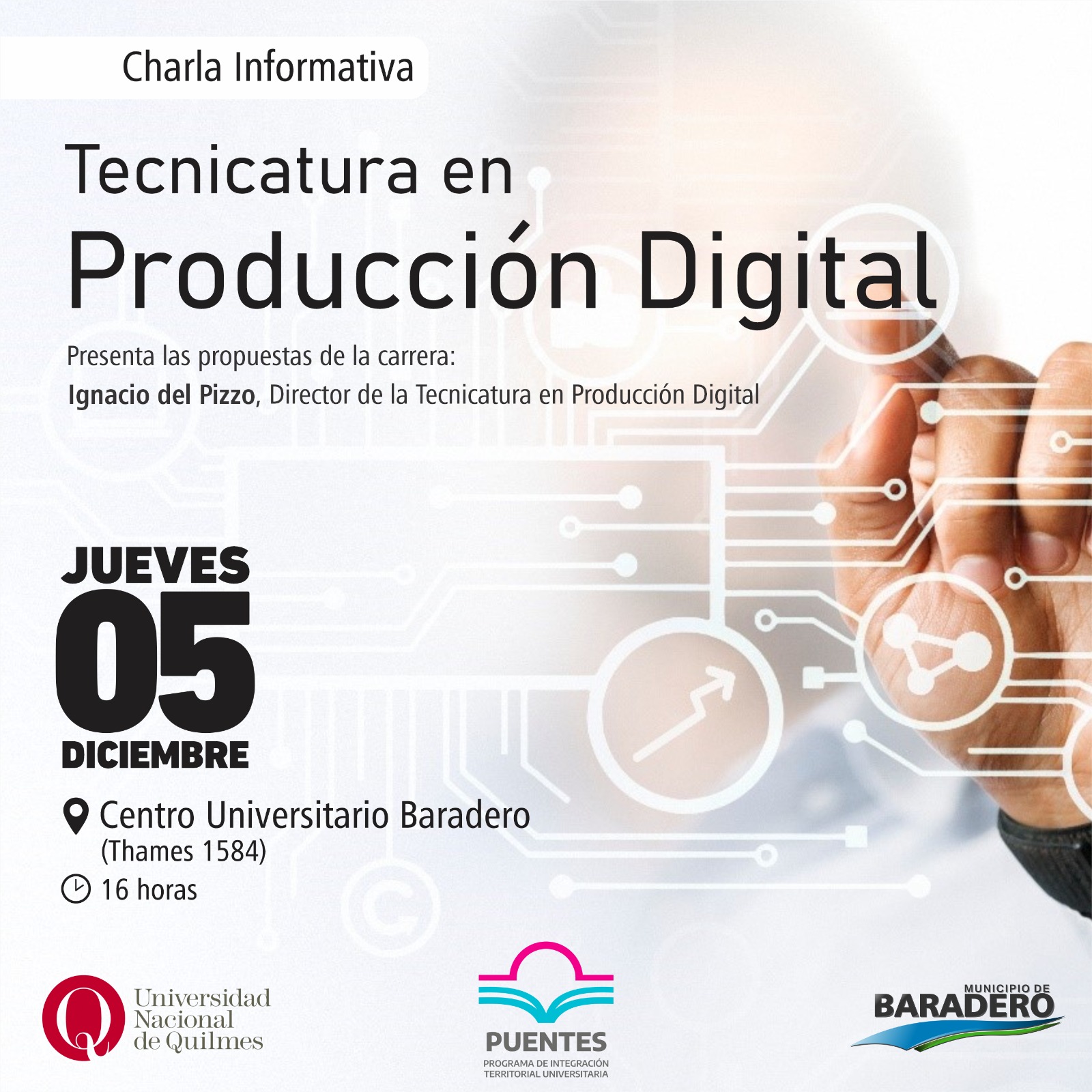 El jueves 5 de diciembre, a las 16.00 horas, se brindará una charla informativa, a cargo de del director de la Tecnicatura en Producción Digital, Ignacio del Pizzo, para que las personas interesadas puedan conocer los detalles de esta nueva propuesta académica, de modalidad semi presencial y con una duración de tres años.