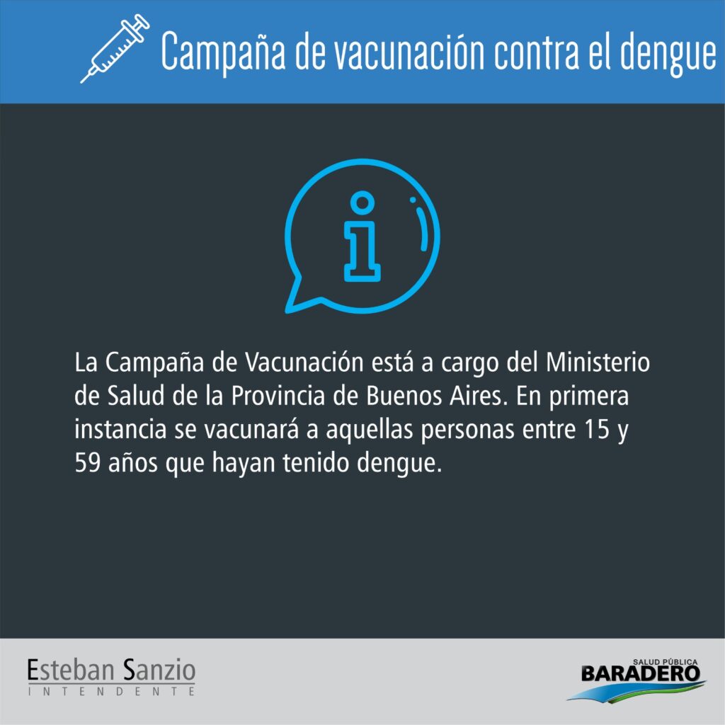 La campaña de vacunación está a cargo del Ministerio de Salud de la Provincia de Buenos Aires. En esta segunda etapa de vacunación se amplió la convocatoria para vacunar contra el dengue a todas las personas que hayan tenido la enfermedad y residan en alguno de los 135 distritos de la Provincia de Buenos Aires.