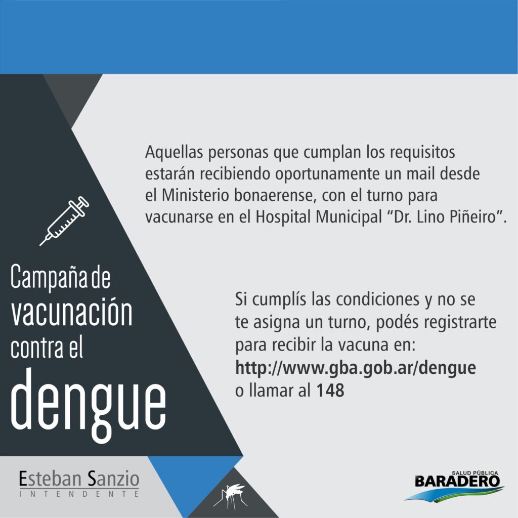 Aquellas personas que cumplan los requisitos estarán recibiendo oportunamente un mail con el turno para vacunarse en el Hospital Municipal “Dr. Lino Piñeiro”. Si cumplís las condiciones y no se te asigna un turno, podés registrarte para recibir la vacuna en: http://www.gba.gob.ar/dengue o llamar al 148.