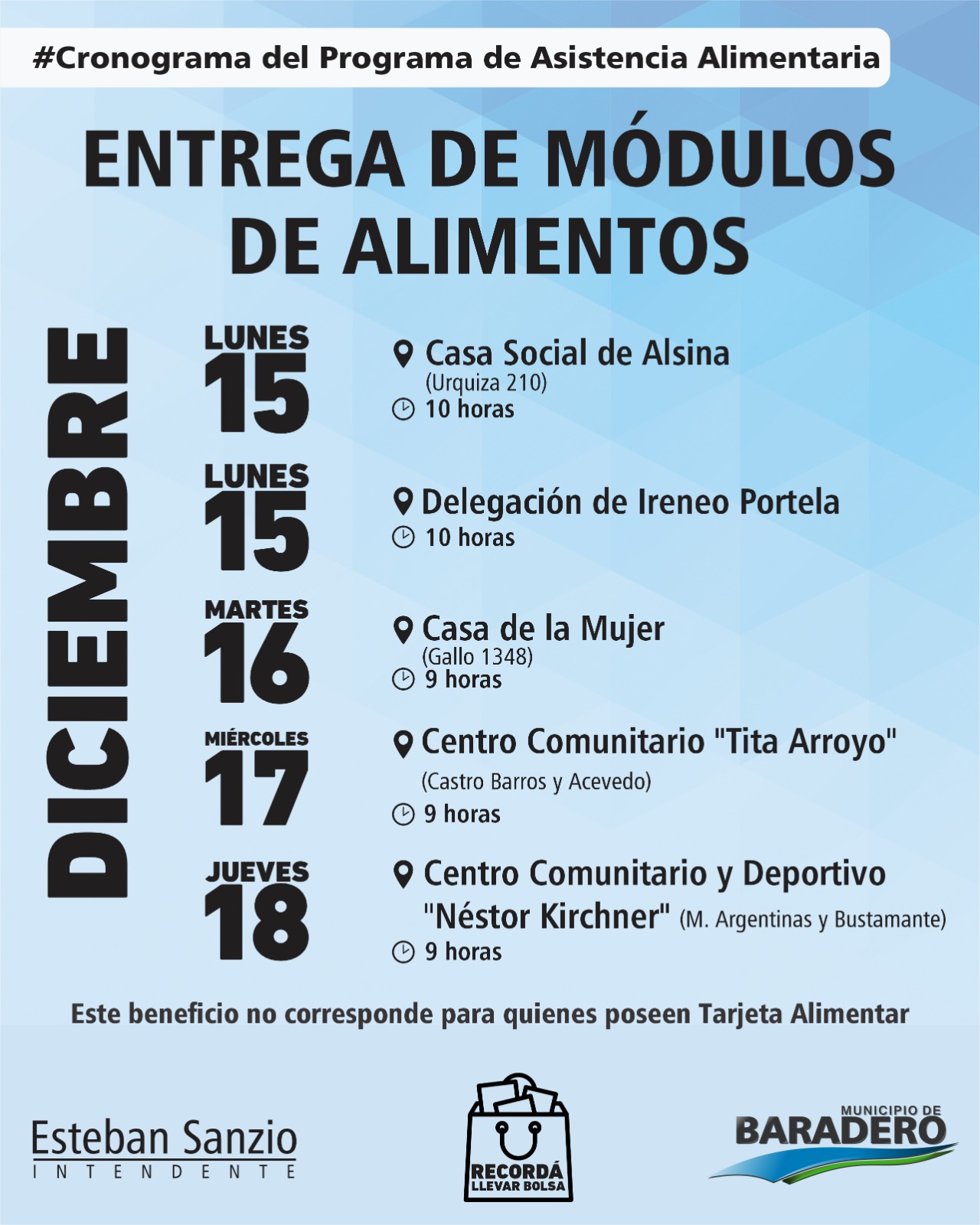 En el marco del Programa de Asistencia Alimentaria, el Municipio de Baradero mediante la Secretaría de Desarrollo Social comunica las fechas de entrega de módulos de alimentos que se llevarán adelante en los distintos centros barriales y localidades de la ciudad en el mes de diciembre.
