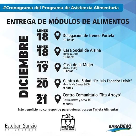En el marco del Programa de Asistencia Alimentaria, el Municipio de Baradero mediante la Secretaría de Desarrollo Social comunica nuevas fechas de entrega de módulos de alimentos que se llevarán adelante en los distintos centros barriales y localidades de la ciudad en diciembre.