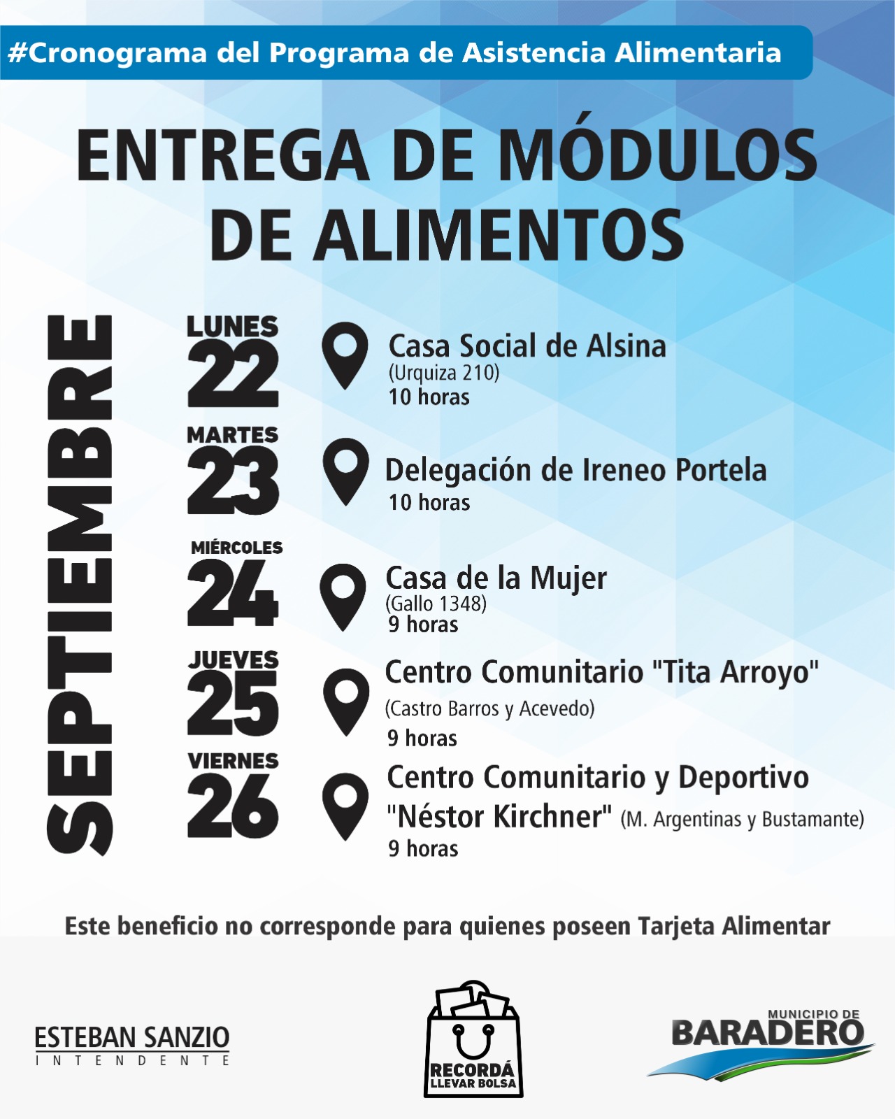 En el marco del Programa de Asistencia Alimentaria, el Municipio de Baradero mediante la Secretaría de Desarrollo Social comunica las fechas de entrega de módulos de alimentos que se llevarán adelante en los distintos centros barriales y localidades de la ciudad en el mes de septiembre.