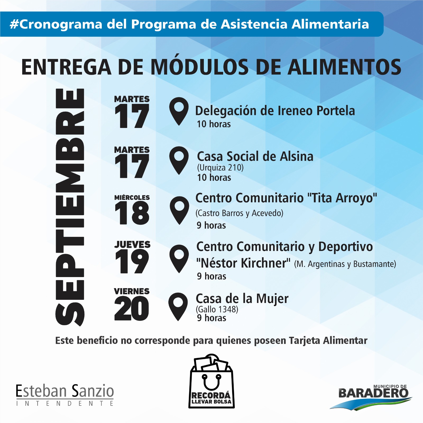 En el marco del Programa de Asistencia Alimentaria, el Municipio de Baradero mediante la Secretaría de Desarrollo Social comunica nuevas fechas de entrega de módulos de alimentos que se llevarán adelante en los distintos centros barriales y localidades de la ciudad en septiembre.