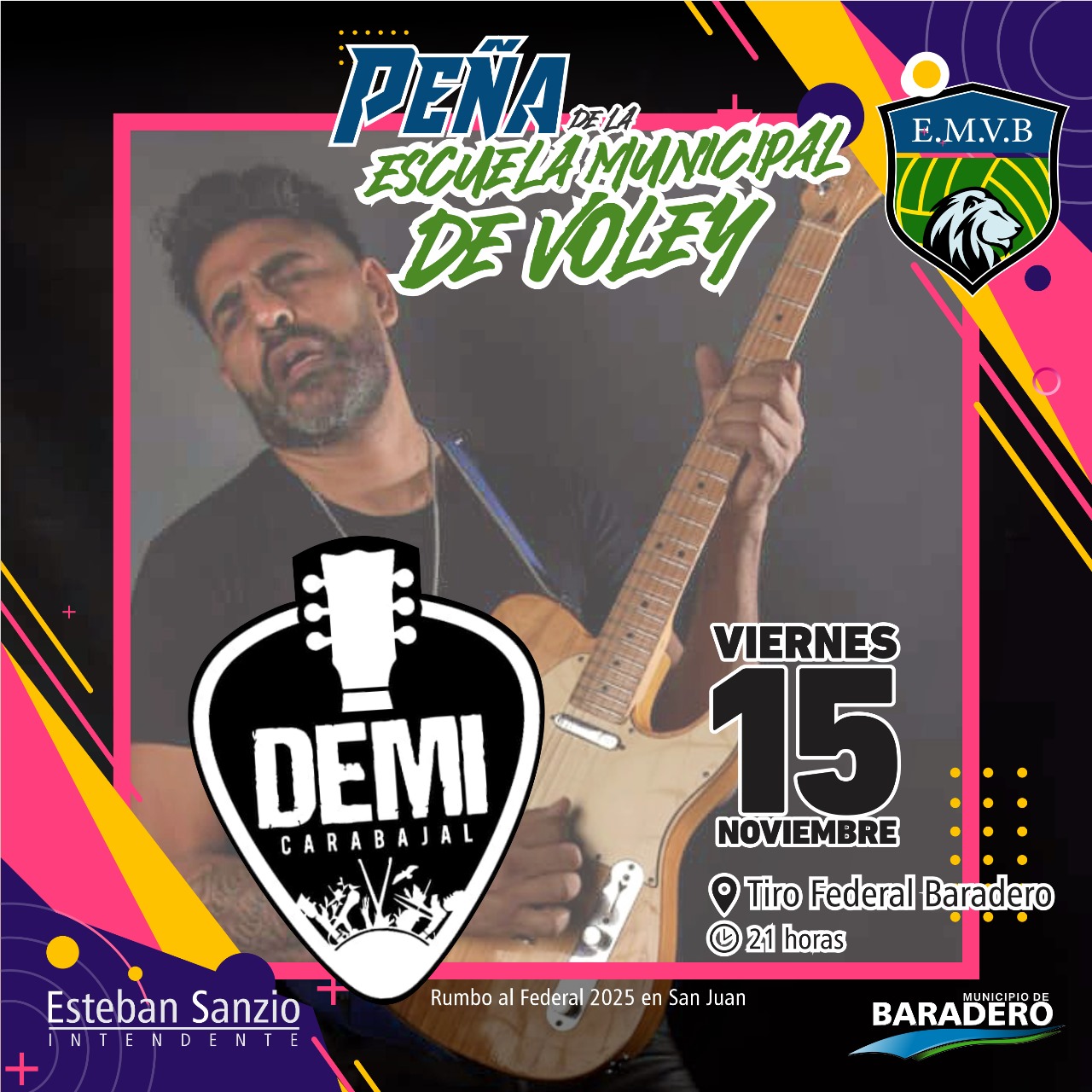El municipio de Baradero informa que Demi Carabajal estará presente en la Peña que se llevará adelante el viernes 15 de noviembre en el Tiro Federal Baradero con el fin de recaudar fondos para que las y los deportistas participen del Federal 2025 que se desarrollará en San Juan.