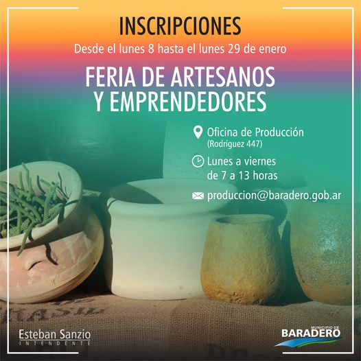 El Municipio de Baradero mediante la Dirección General de Producción informa a la comunidad que el lunes 8 de enero abre la inscripción para participar en la Feria de Artesanos y Emprendedores durante la Final Nacional del Pre-Festival Baradero y el 49° Festival Nacional de Música Popular Argentina Baradero 2024.