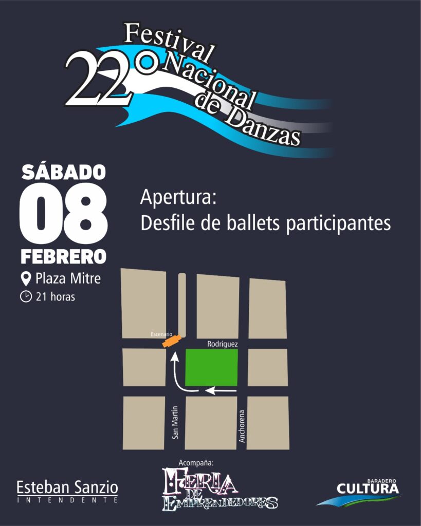 El 8 de febrero a partir de las 21 horas en Plaza Mitre se desarrollará el 22° Festival Nacional de Danzas, organizado por el Municipio de Baradero a través de la Secretaría de Cultura, Educación, Comunicación y Deportes y el Ballet Municipal “Sixto Palavecino”.