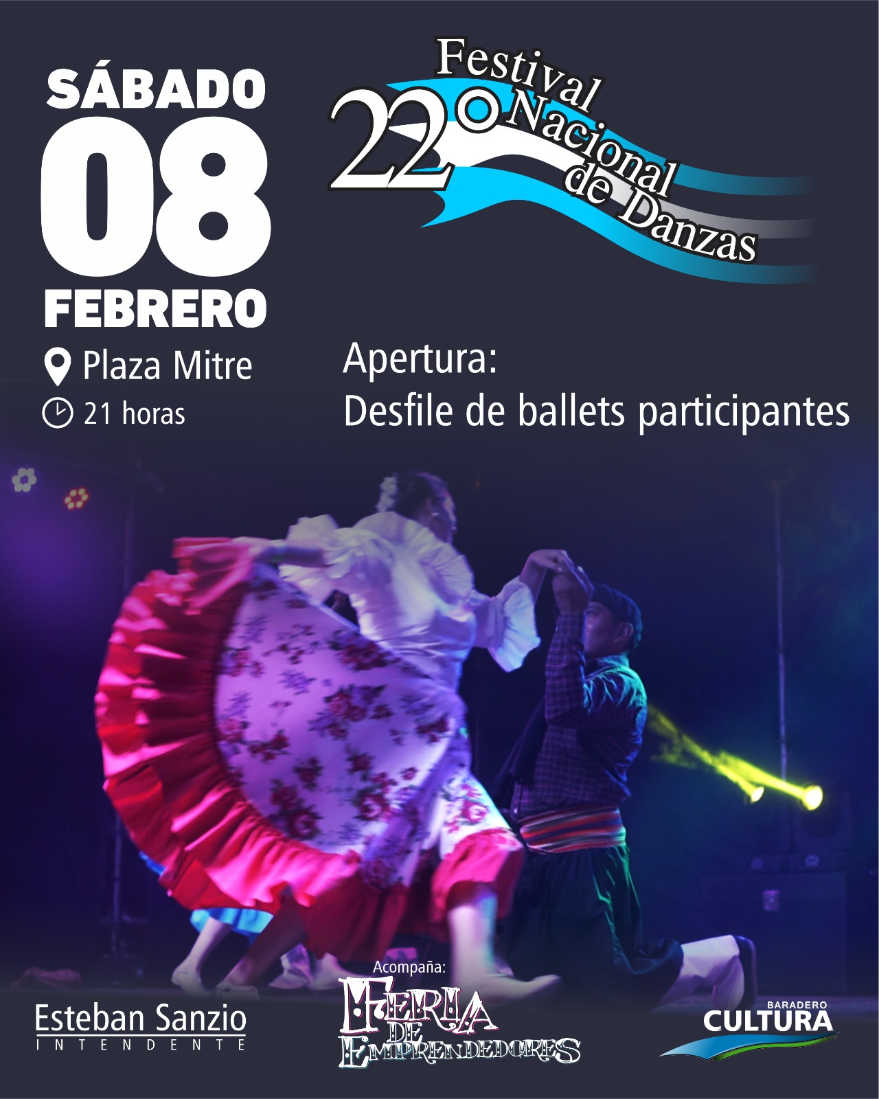El 8 de febrero a partir de las 21 horas en Plaza Mitre se desarrollará el 22° Festival Nacional de Danzas, organizado por el Municipio de Baradero a través de la Secretaría de Cultura, Educación, Comunicación y Deportes y el Ballet Municipal “Sixto Palavecino”.