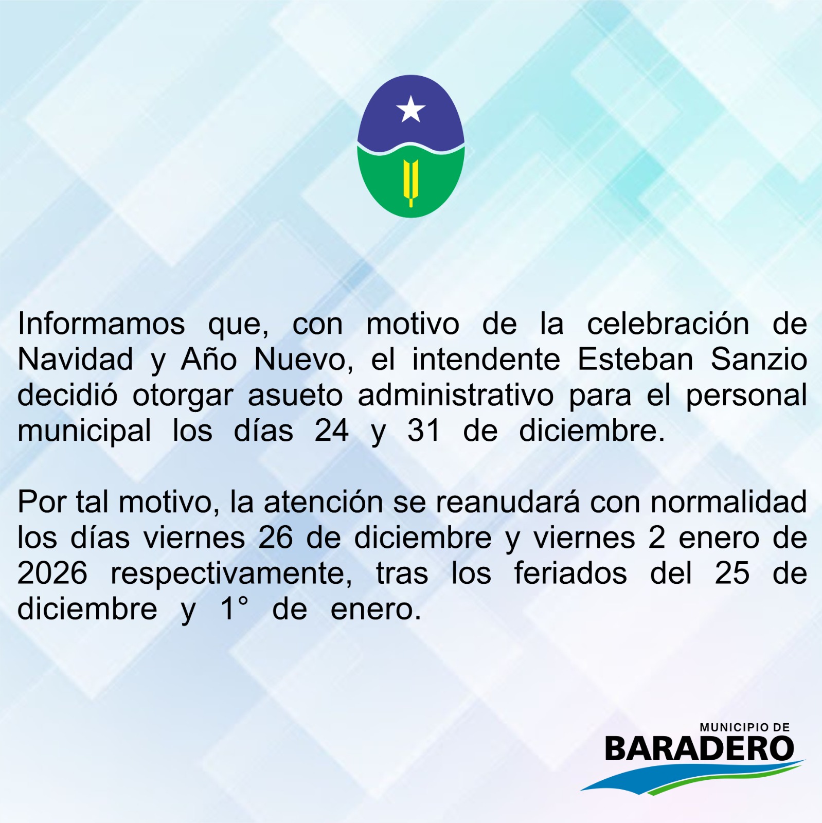 El Municipio de Baradero informa a la comunidad que, en el marco de las celebraciones de Navidad y Año Nuevo y por decisión del intendente Esteban Sanzio, se ha declarado asueto administrativo para el personal municipal los días 24 y 31 de diciembre.