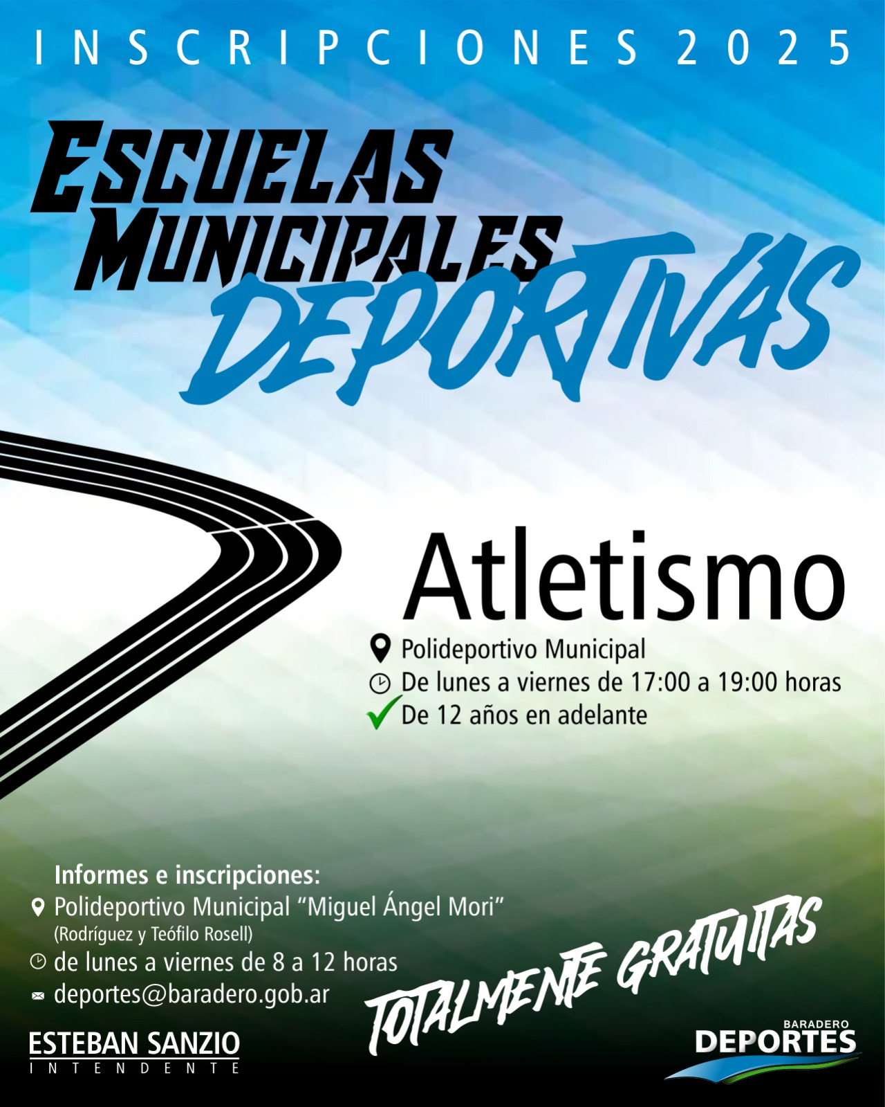 El Municipio de Baradero, a través de la dirección de Deportes perteneciente a la secretaría de Cultura, Educación, Comunicación y Deporte, informa que se encuentra abierta la inscripción para las Escuelas Deportivas Municipales, totalmente gratuitas y dirigidas a toda la comunidad de Baradero en las siguientes disciplinas: Canotaje, Handball, Hockey, Vóley, Mini Vóley, Atletismo, Mini Atletismo, Arqueros y Arqueras, Yoga, Boxeo Recreativo, Pádel, Ajedrez; y para Adultas y Adultos Mayores, Educación Física y Ritmos y Movimientos.