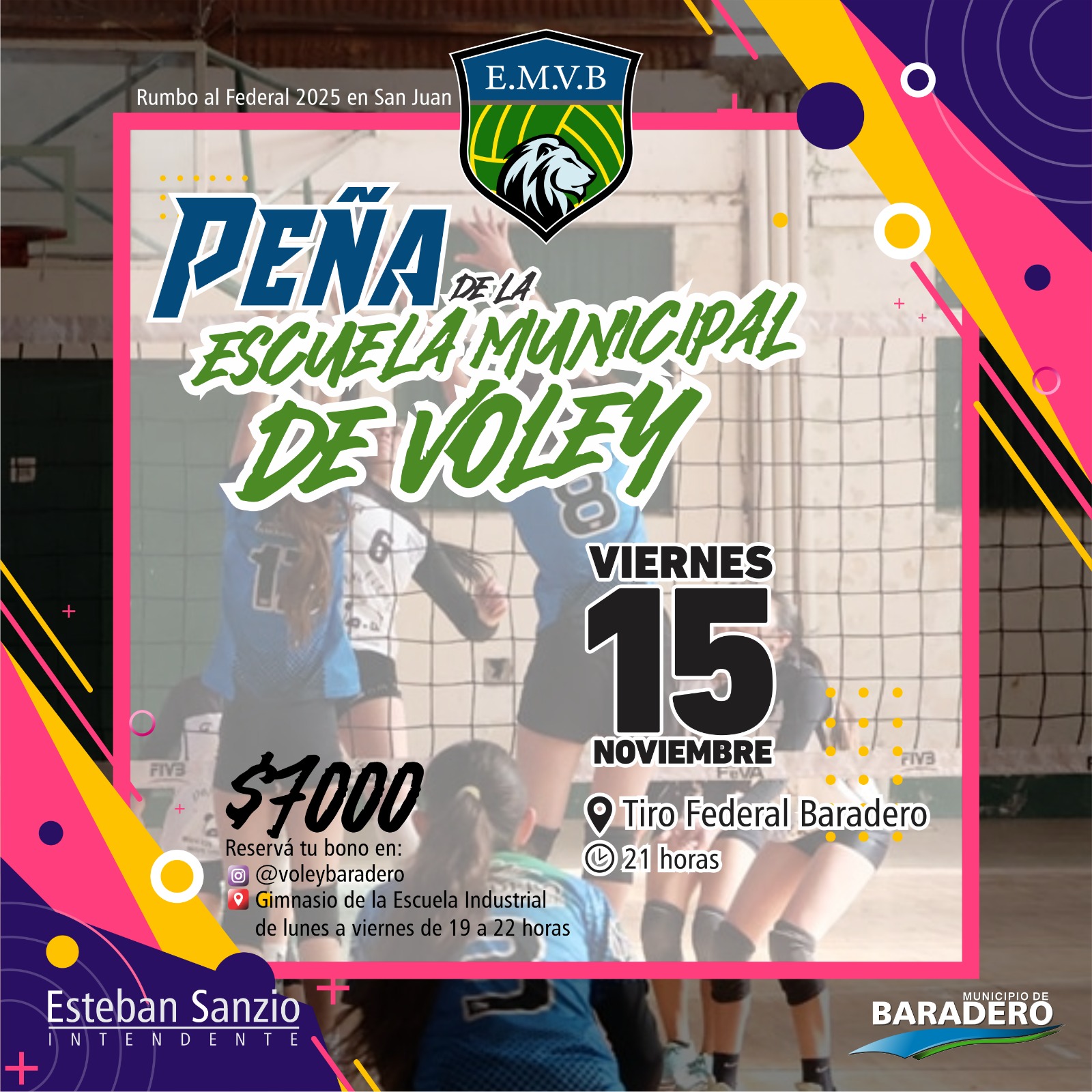 Por primera vez la primera masculina y femenina de la Escuela Municipal de Vóley Baradero clasificó al Federal 2025 en San Juan, por tal motivo y con el objetivo de recaudar fondos para dicho viaje, el Municipio de Baradero a través de la secretaría de Cultura, Educación, Comunicación y Deportes llevará adelante la Peña de la Escuela Municipal de Vóley.