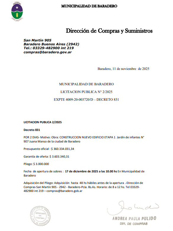 Fecha de apertura de sobres : 17 de diciembre de 2025 a las 10.00 hs En Municipalidad de