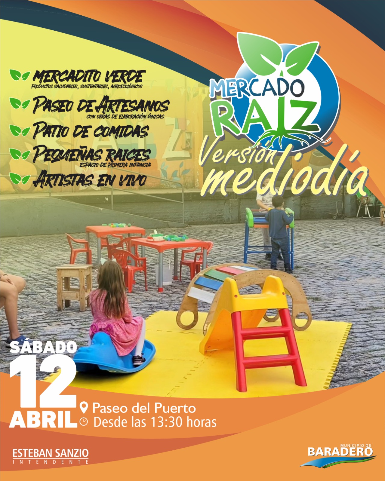 El Municipio de Baradero, a través de la Secretaría de Cultura, Educación, Comunicación y Deportes, informa que este sábado 12 de abril tendrá lugar en el Paseo del Puerto una nueva edición de Mercado Raíz, en esta ocasión en su versión mediodía.