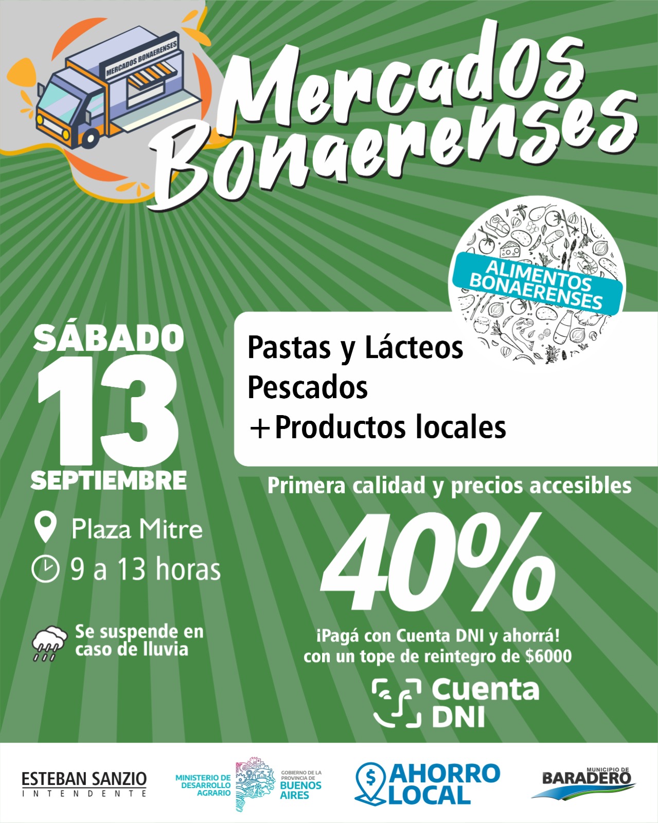 El Municipio de Baradero, a través de la subsecretaría de Producción y Desarrollo Económico, comunica que el próximo sábado 13 de septiembre, a partir de las 9 horas, se realizará en Plaza Mitre una nueva edición de Mercados Bonaerenses.