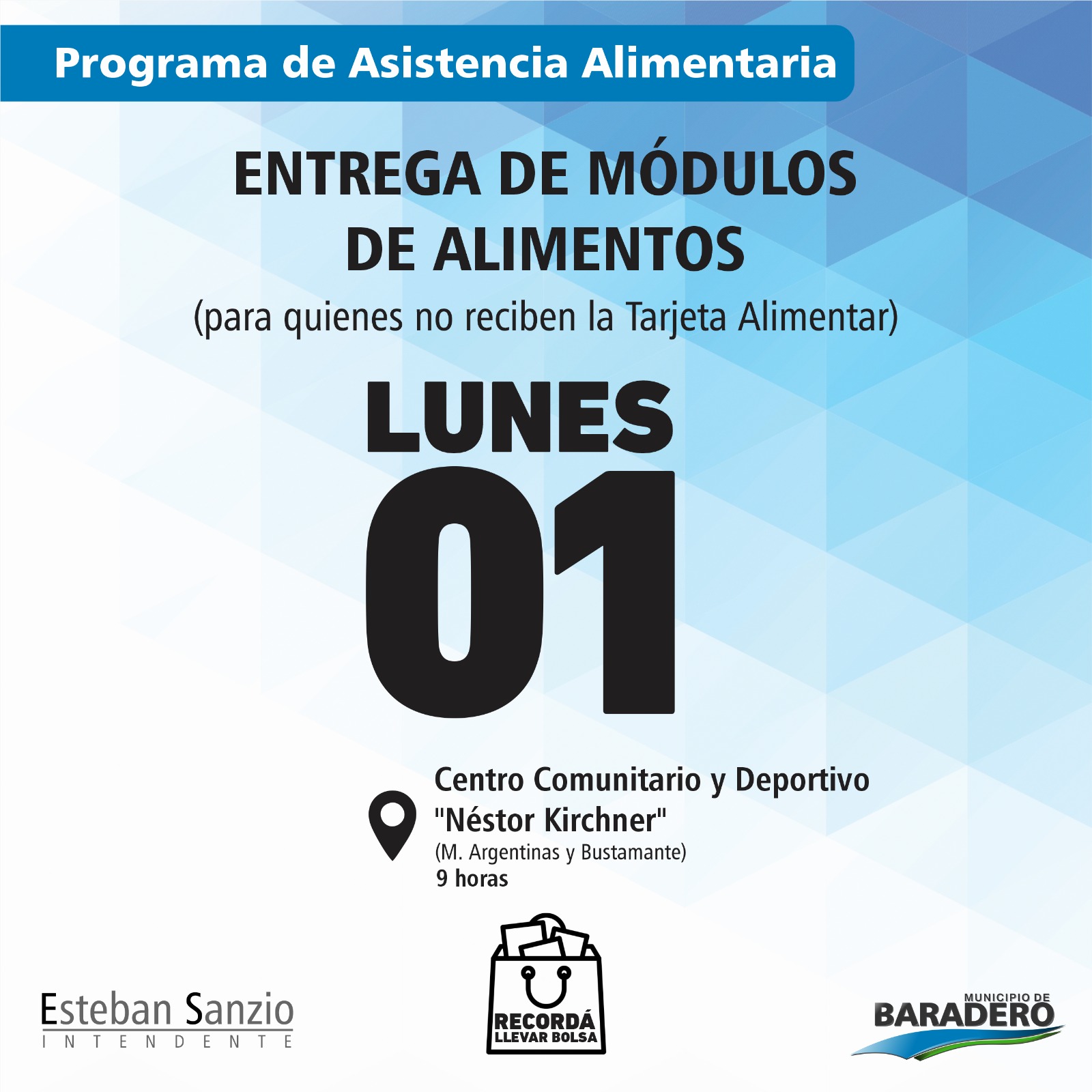 El Municipio de Baradero, mediante la Secretaría de Desarrollo Social, en el marco del Programa de Asistencia Alimentaria, informa que se reprograma la entrega de módulos de alimentos del día jueves 27 de junio en el Centro Comunitario y Deportivo «Néstor Kirchner» para el lunes 1° de julio a partir de las 9 horas en el mismo lugar.