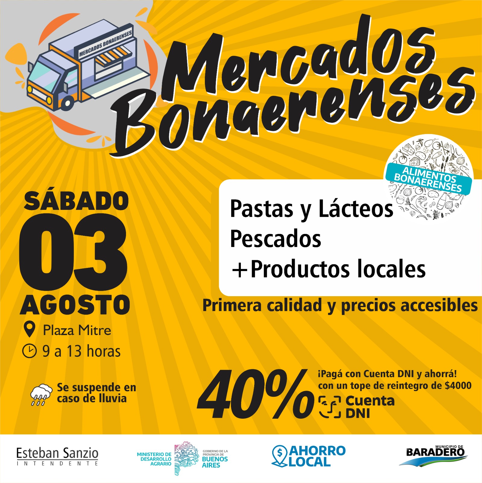Este sábado 3 de agosto, entre las 9 y las 13 horas, se concretará una nueva edición de Mercados Bonaerenses, con la oferta de productos de primera calidad a precios más que accesibles. Además, podrán aprovecharse los descuentos del 40% pagando con Cuenta DNI, con tope de reintegro de 4 mil pesos por persona.